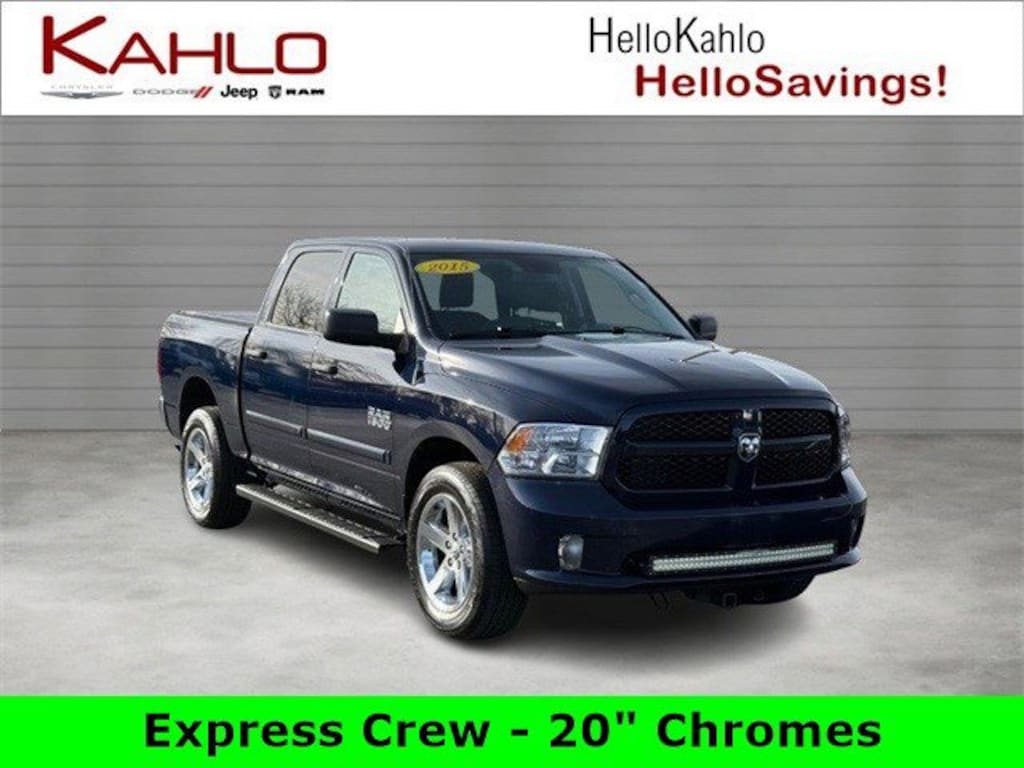 2015 Ram 1500 4dr. Crew Cab, 3.6L V6 24V VVT 8-Speed Automatic 4WD, 3.6L V6 24V VVT 8-Speed Automatic 4WD, 20 x 8 Aluminum Wheels, 40/20/40 Split Bench Seat, 6 Speakers, Electronic Shift, Fog Lamps, Integrated Voice Command w/Bluetooth, Popular Equipment Group, Quick Order Package 22C Express, Radio: Uconnect 5.0 AM/FM/BT, Remote Keyless Entry w/All-Secure, SIRIUSXM Satellite Radio.